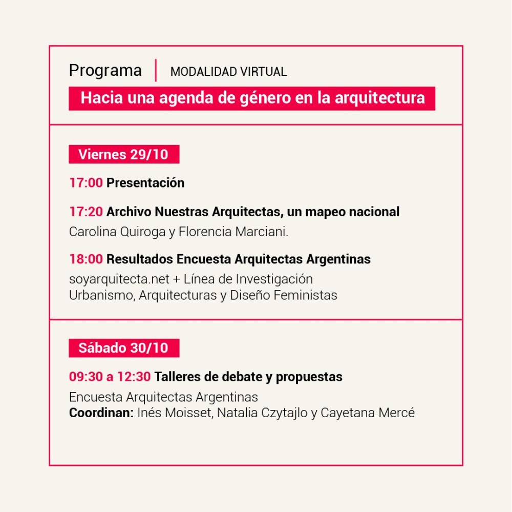 A las 18:00 comenzará la presentación de los resultados de la Encuestas Arquitectas Argentinas, a cargo de Silvana Parentella, Valeria del Puerto y Cayetana Mercé por soyarquitecta.net y de Inés Moisset y Natalia Czytajlo de la Línea de Investigación Urbanismo, Arquitecturas y Diseño Feministas.