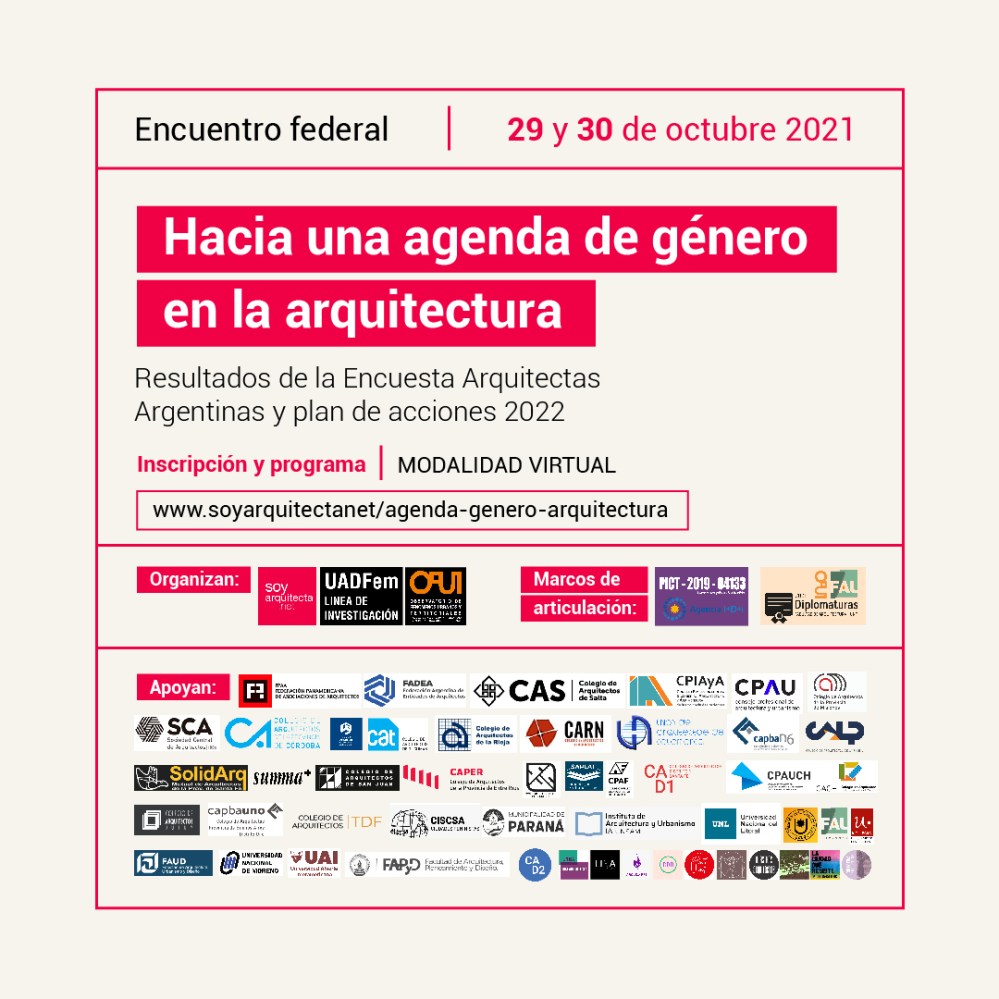 La Línea de Investigación Urbanismo, Arquitecturas y Diseño Feministas y la red profesional soyarquitecta.net invitan a participar de las jornadas “Hacia una agenda de género en la arquitectura-Resultados de la Encuesta Arquitectas Argentinas”, que se llevarán a cabo el 29 y el 30 de octubre en formato online.