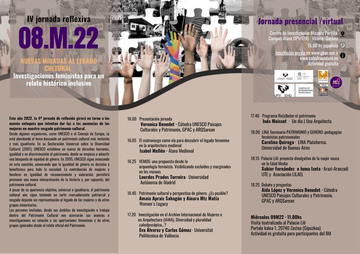 En conmemoración al Día Internacional de la Mujer, este año 2022, acompañamos al @gpac_upv_ehu, la cátedra UNESCO Paisajes Culturales y Patrimonio y la plataforma @patrimoniosxx de la Universidad del País Vasco, la 4º jornada de reflexión 8M, que girará en torno a los nuevos enfoques que intentan dar luz a las ausencias de las mujeres en nuestro sesgado patrimonio cultural.El evento se realizará presencial en la ciudad de Vitoria-Gasteiz y/o virtual el día 8 de marzo de 16 a 19hs española.