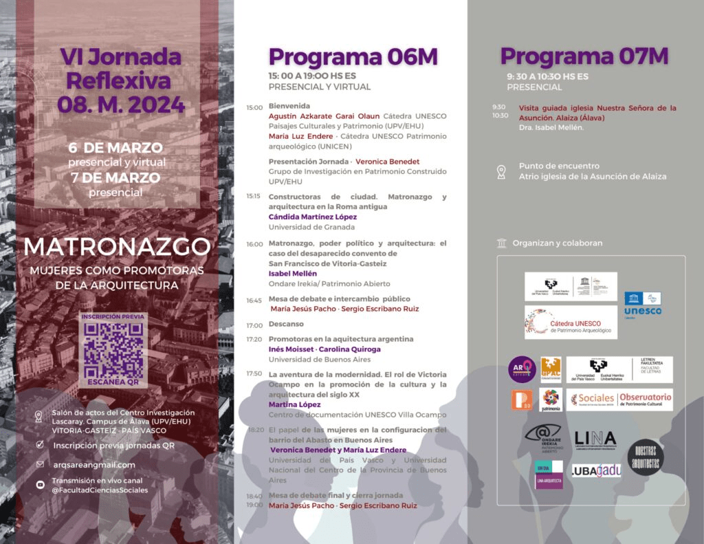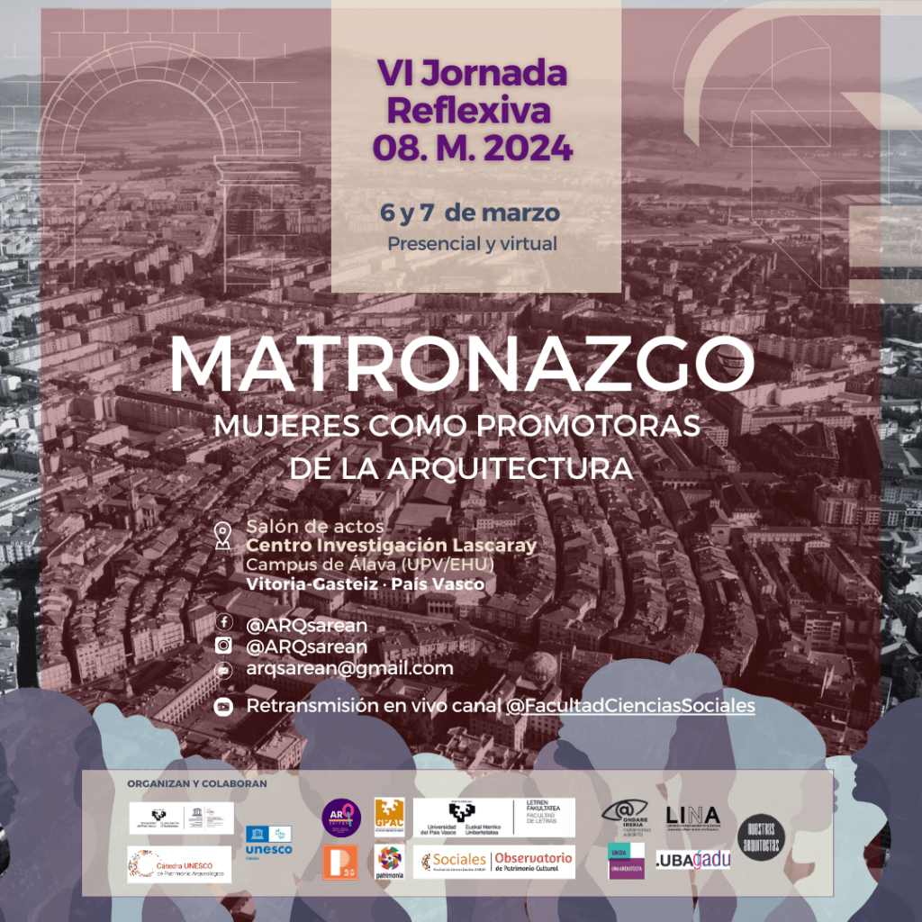 En conmemoración al «Día Internacional de la Mujer», desde 2019 venimos realizando estas jornadas reflexivas organizadas por ARQsarean (plataforma feminista de divulgación y visibilización de la Arquitectura, Urbanismo y Patrimonio) con el apoyo de nuestros grupos de investigación de la Universidad del País Vasco, Grupo de investigación en Patrimonio Construido (GPAC) y Cátedra UNESCO Paisajes Culturales y Patrimonio y este año con la colaboración internacional de la Cátedra UNESCO en Patrimonio Arqueológico de la Universidad Nacional del Centro de la Provincia de Buenos Aires (UNICEN). Asimismo, nos acompañan las siguientes instituciones nacionales e internacionales: Patrimonia-INCUAPA (UNICEN), Observatorio de Patrimonio Cultural (UNICEN), Ondare Irekia/Patrimonio Abierto, Patrimonio Siglo XX y los colectivos feministas “Nuestras Arquitectas”, “Programa GADU (FADU-UBA)”, “Un día | Una Arquitecta” y la plataforma “LINA> laboratorio: intervención+arquitectura”. Este año contamos con la financiación de la Facultad de Letras de la UPV/EHU
